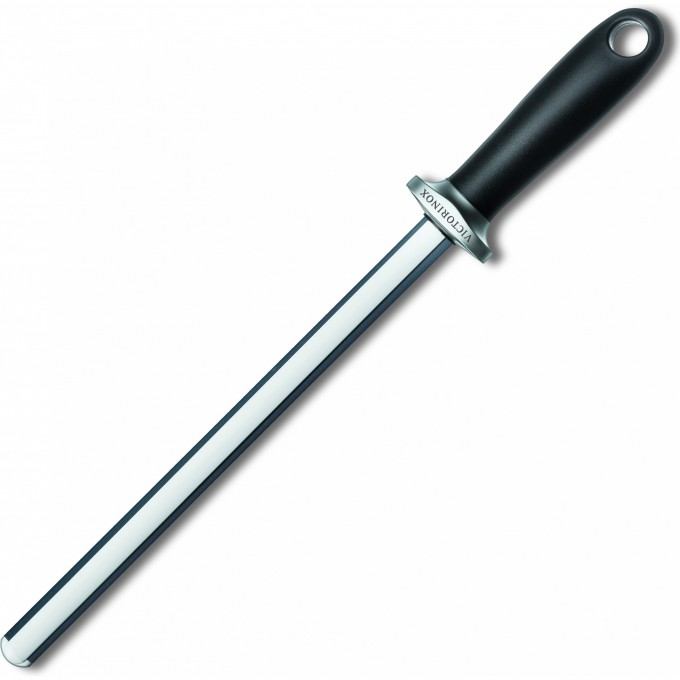 Уникальный мусат Victorinox. На пластиковой рукояти черного цвета удобное круглое отвертсвие для подвеса. Насечка овальная длиной 260 мм.